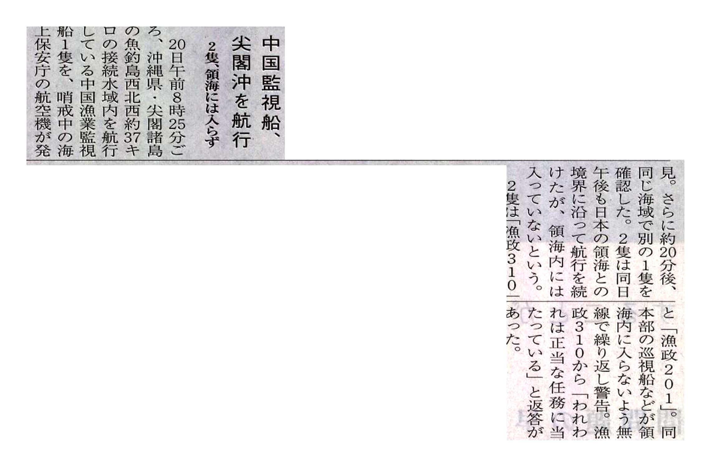 > 中国監視船、尖閣沖を航行/2隻、領海には入らず: