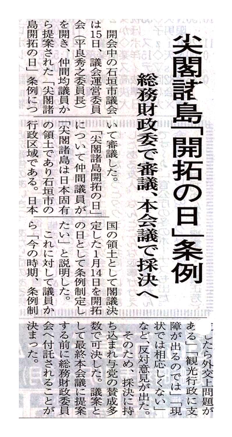 > 尖閣諸島「開拓の日」条例/総務財政委で審議、本会議で採決へ: