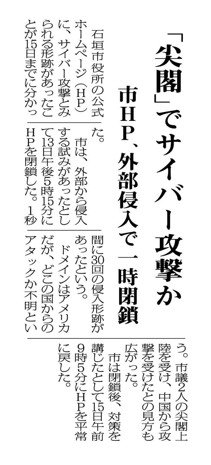 > 「尖閣」でサイバー攻撃か 市HP、外部侵入で一時閉鎖: