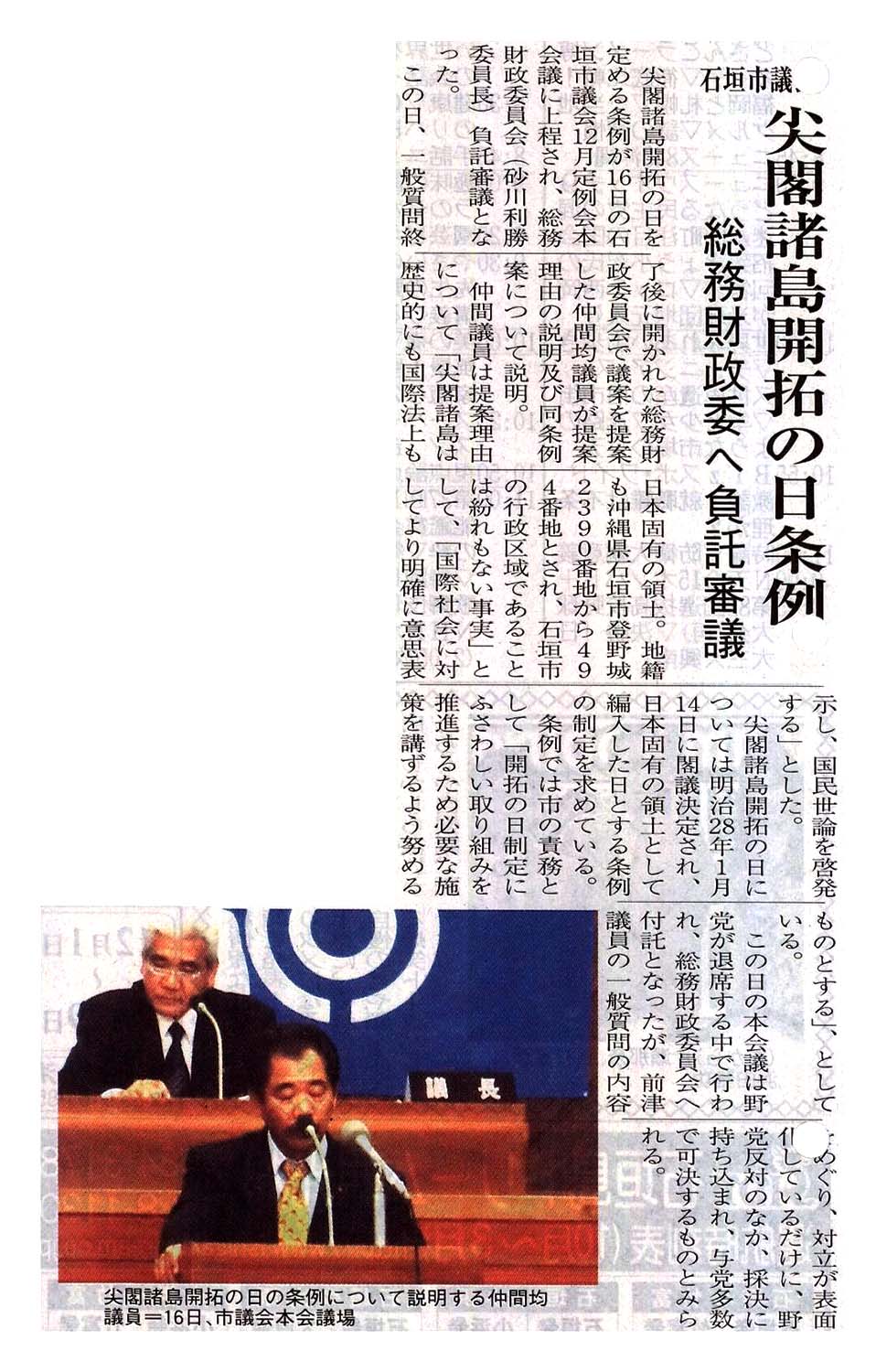 > 石垣市議会/尖閣諸島開拓の日条例/総務財政委へ負託審議:
