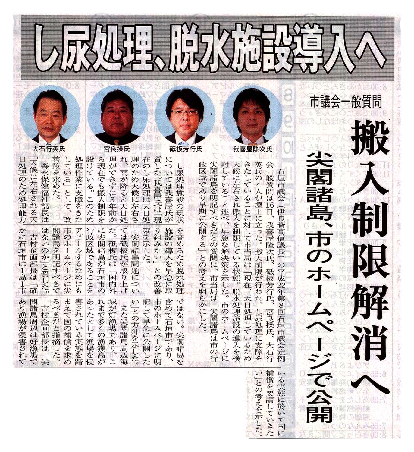 し尿処理、脱水施設導入へ/市議会一般質問/搬入制限解消へ/尖閣諸島、市のホームページで公開