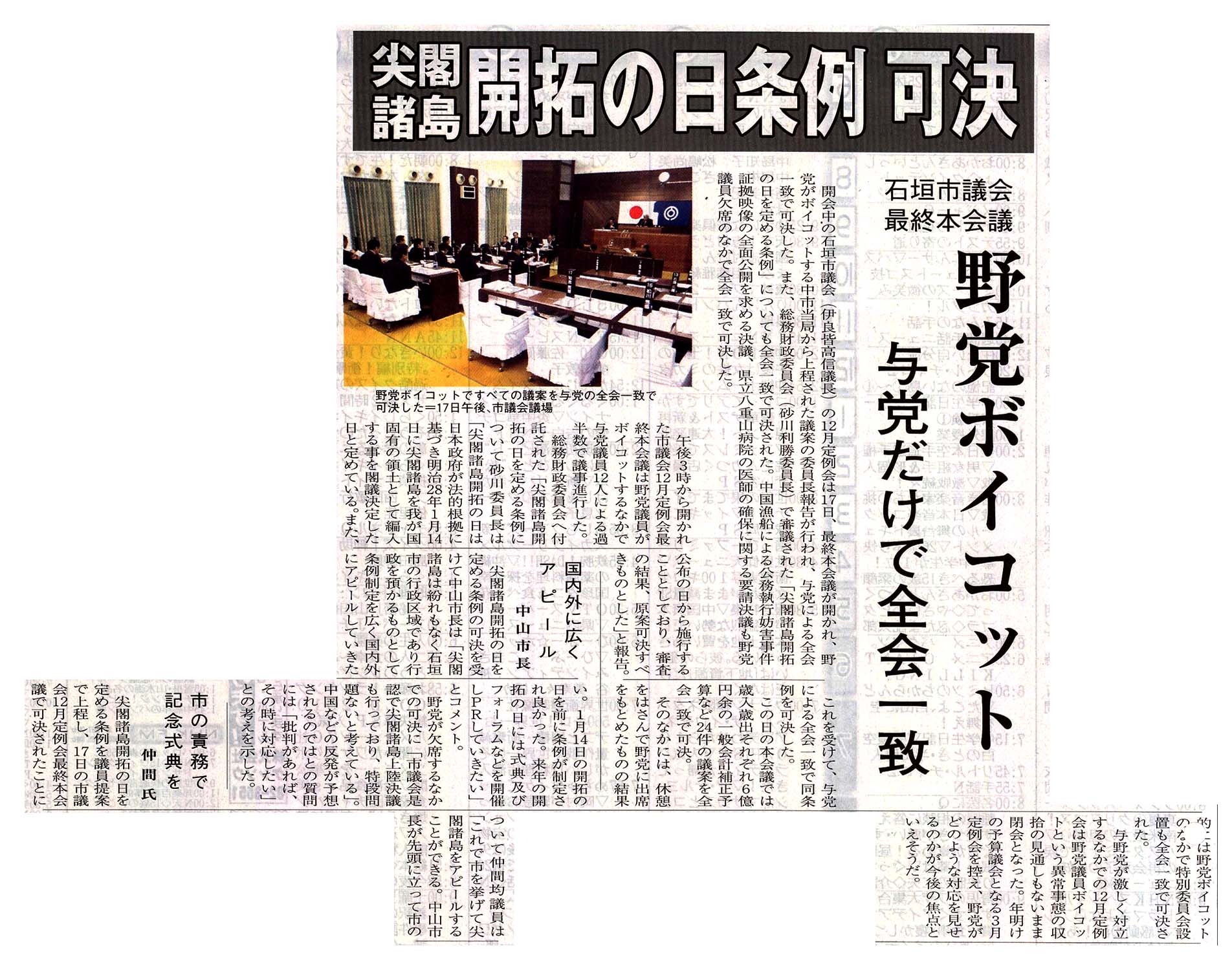 > 尖閣諸島 開拓の日条例可決/石垣市議会最終本会議/野党ボイコット/与党だけで全会一致: