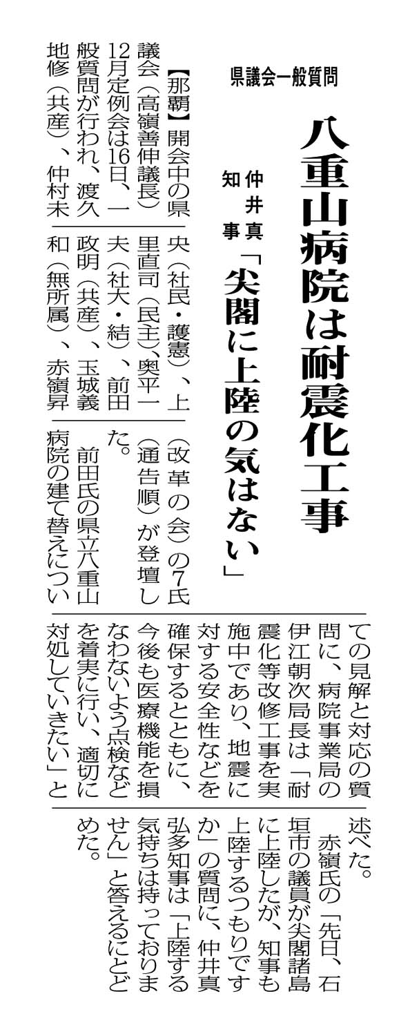 > 県議会一般質問/八重山病院は耐震化工事/仲井真知事 「尖閣に上陸の気はない」: