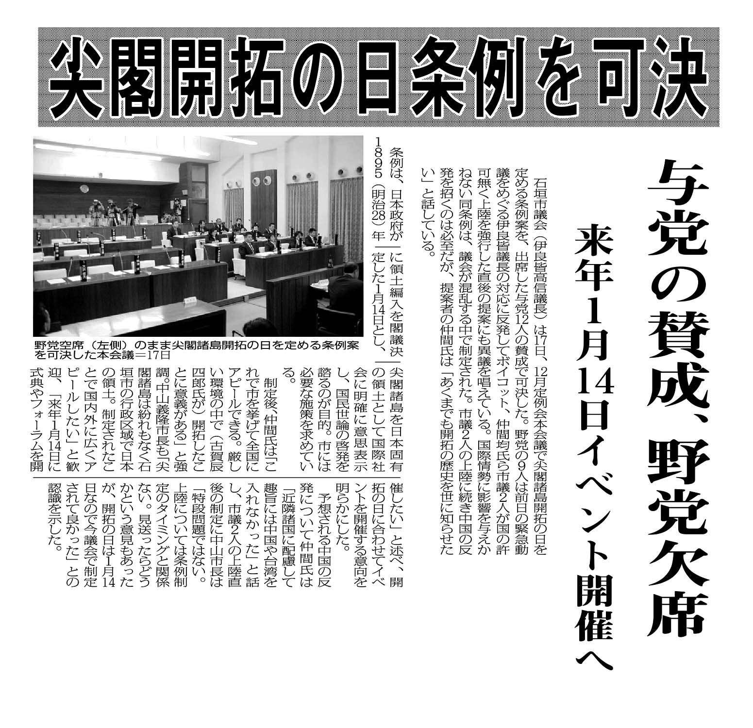 > 尖閣開拓の日条例を可決/与党の賛成、野党欠席/来年1月14日イベント開催へ :