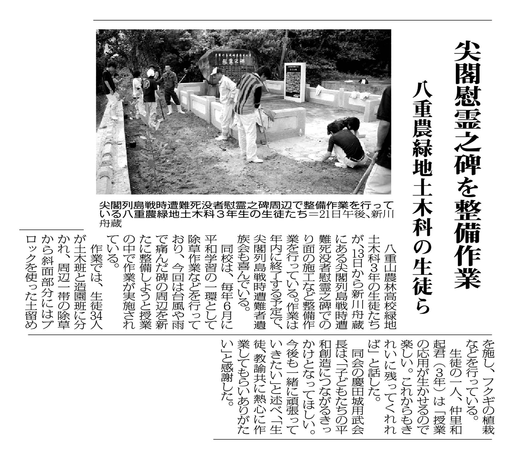 > 尖閣慰霊之碑を整備作業/八重農緑地土木科の生徒ら: