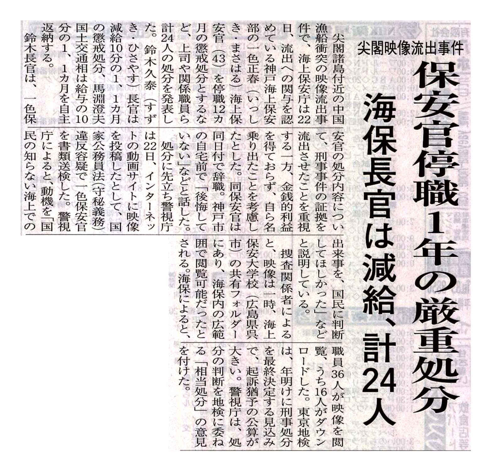 > 尖閣映像流出事件/保安官停職1年の厳重処分/海保長官は減給、計24人: