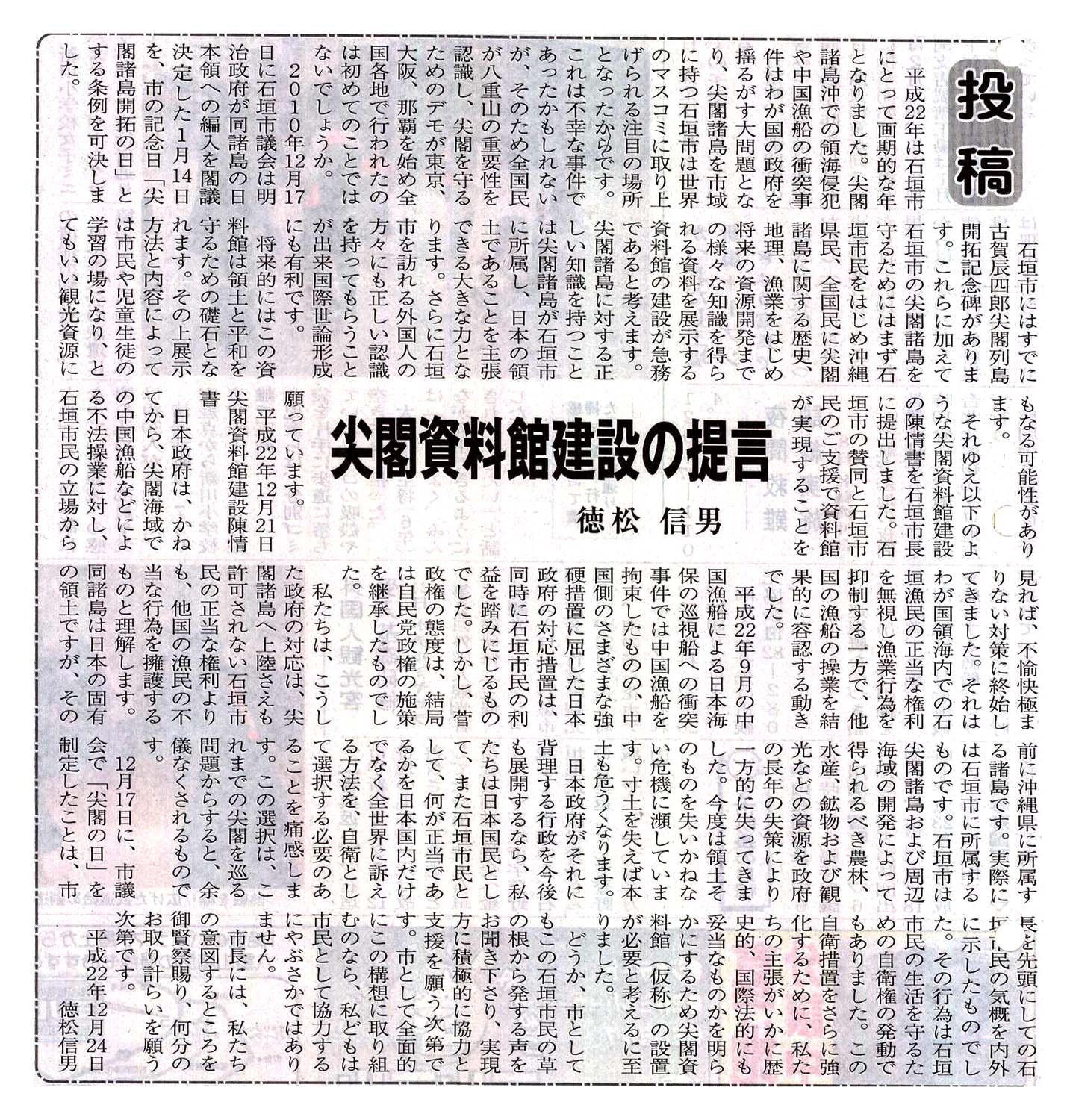 > <投稿>尖閣資料館建設の提言/徳松信男: