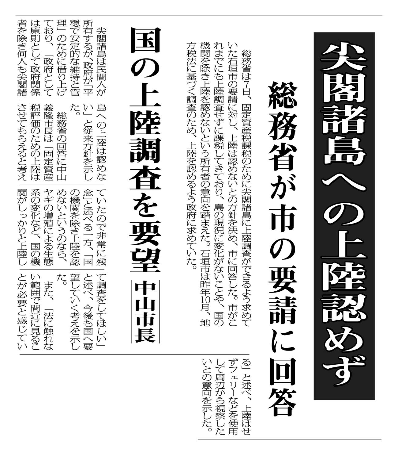 > 尖閣諸島への上陸認めず/総務省が市の要請に回答/国の上陸調査を要望/中山市長:
