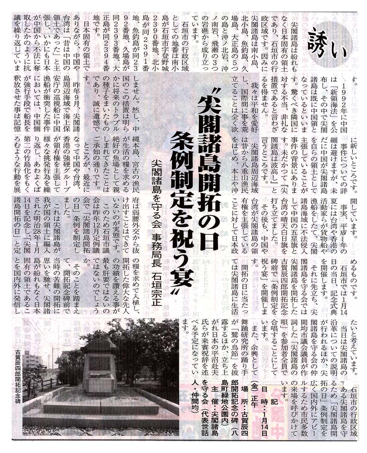 > <誘い>”尖閣諸島開拓の日 条例制定を祝う宴”/尖閣諸島を守る会 事務局長 石垣宗正: