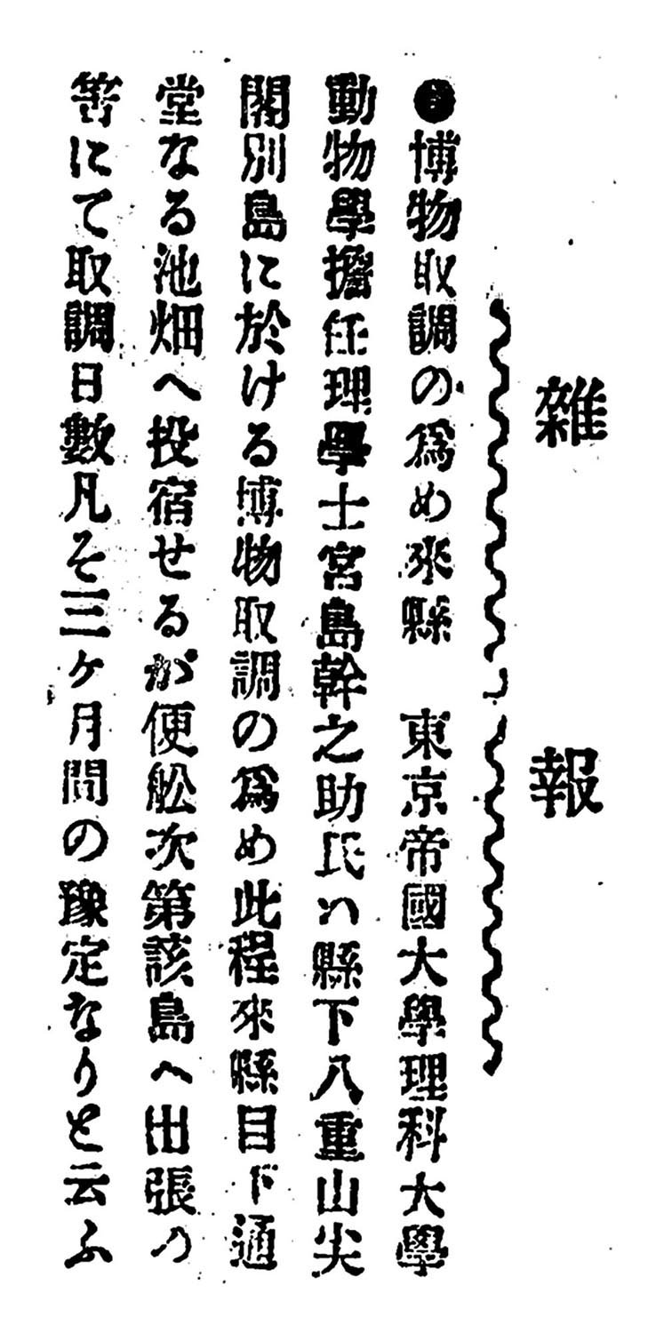 東京帝国大学理科大学動物学担任理学士宮島幹之助氏は、県下八重山尖閣列島に於ける博物取調の為め此程来県。目下通堂なる池畑へ投宿せるが、便船次第該島へ出張の筈にて取調日数凡そ三ヶ月間の予定なりと言う。