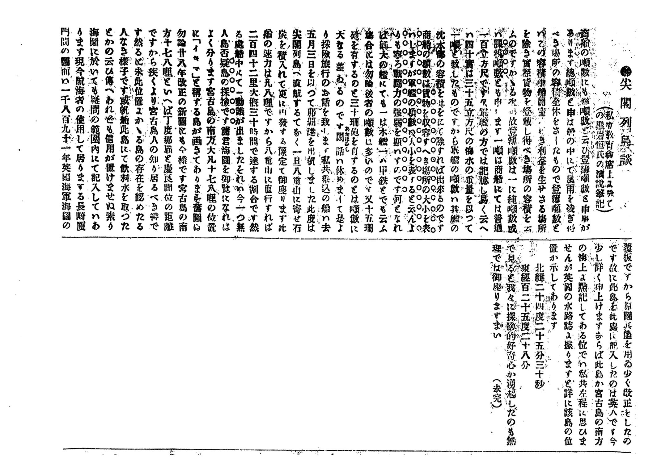 商船の噸數にも総噸數と云ひ登簿噸數と申事があります總噸數と申は船の中にて風雨を凌ぎ得べき場所の容積全体をさしたもので登簿噸數とハこの容積中船員室■■き利益を生せさる場所を除き實際貨物を登載し得べき場所の容積を云ふのですかゝる次第故登簿噸數は一に純噸數或ハ課税噸數とも申します一噸は商船にては普通一百立方尺です又軍艦の方では記臆し易く云へハ四十實は三十五立方尺の海水の重量を以つて一噸と致したものですから軍艦の噸數ハ其艦の沈水部の容積を■をにて除すれば出來るのです商船の頓數は貨物を収容すへき場所の大小を表ハしますが軍艦の頓數ハ大小を表すると云んよりも寧ろ戰鬪力の強弱を顕ハすのです何となれは同大の艦にても一は木艦一ハ甲鉄とでも云ふ場合には勿論後者の噸數に多いのです又十五珊砲を有するのと三十珊砲を有するのとは噸數に大なる差あるのです閑話ハ休めまして是より採險旅行のお話を致します私共乘込の船ハ去五月三日を以つて那覇港を出帆しました此度は尖閣列島へ直航するてなく一旦八重山に寄せ石炭を積入れて更に出發する豫定て御座ります此船の速力は凡八哩ですから八重山に直行すれば二百四十二里大概三十時間で達する割合です然る處船中にて一動議が出ましたそれハ今一つ無人島否疑島の探檢です諸君海圖を御覧になれはよく分ります宮古島の南方大凡十七八哩の位置に「イキマ」と稱する島が画きてあります舊圖は勿論廿八年改正の新圖にも仝様です宮古島の南方十七八哩といへば丁度那覇と慶良間位の距離ですから疾くより宮古島人の知り居るべき筈です然るに未此位置にかゝる島の存在を認めたる人なき様子です或帆船此島にて飮料水を取つたとかの云ひ傳へあれども信用が置けませぬ素り海圖に於いても疑問の範圍内にて記入してハあります現今航海者の使用して居りまする長崎厦門間の■面ハ一千八百九十一年英國海軍海圖の覆板ですから原圖其儘を用ゐ少く改正をしたのです故に此島を此處に記入したのは英人です今少し詳く申上けますならば此島か宮古島の南方の海上に點記してある位でハ私共左程に思ひませんが英國の水路誌に據りますと詳に該島の位置か示してあります