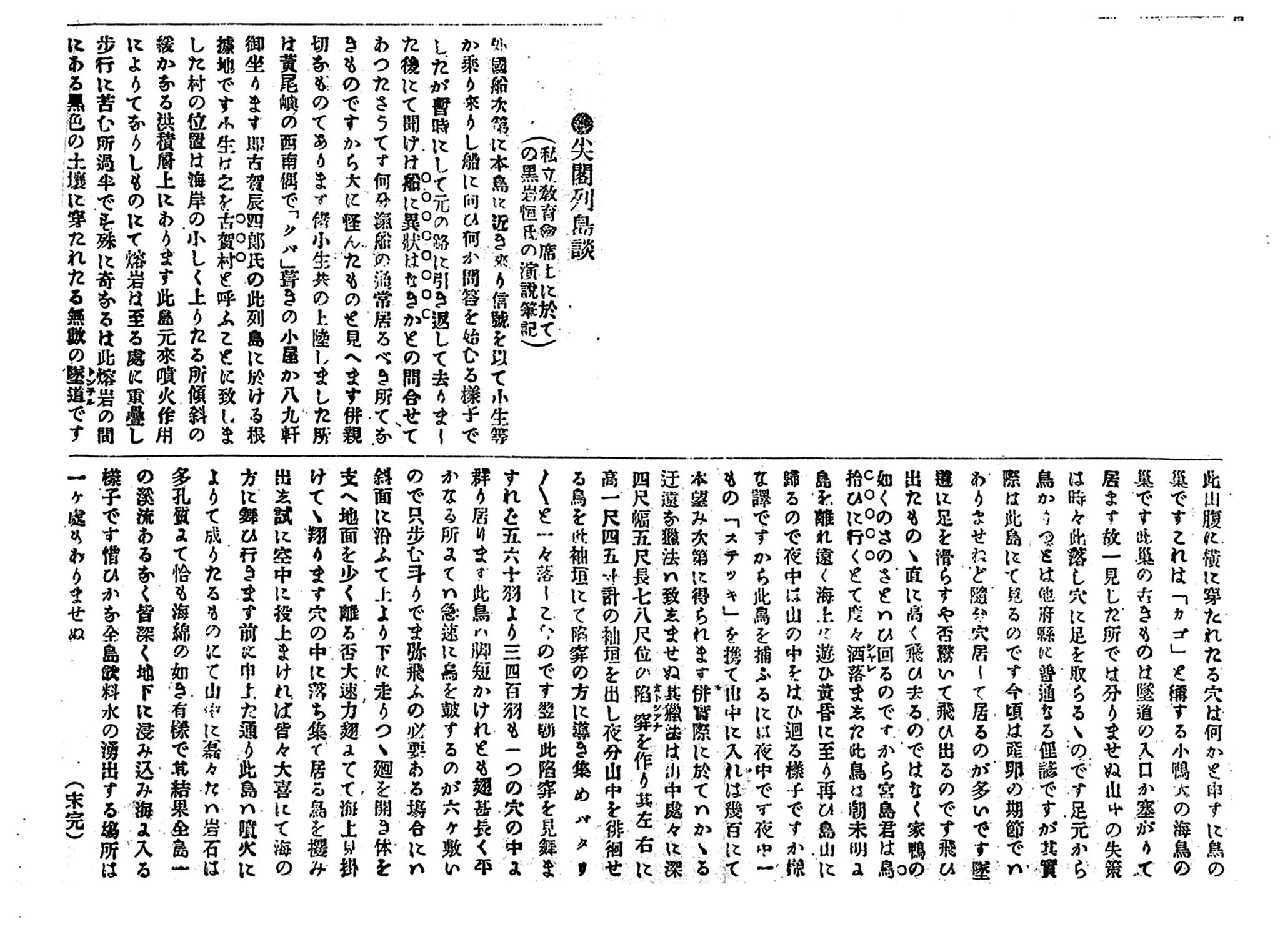 外國船次第に本島に近き來り信號を以て小生等か乘り來りし船に向ひ何か問答を始むる様子でしたが暫時にして元の路に引き返して去りました後にて聞けは船に異狀はなきかとの問合せてあつたさうてす何分滊船の通常居るべき所てなきものですから大に怪んたものと見へます併親切なものてあります偖小生共の上陸しました所は黄尾嶼の西南隅で「クバ」葺きの小屋か八九軒御座ります即古賀辰四郞氏の此列島に於ける根據地です小生は之を古賀村と呼ふことに致しました村の位置は海岸の小しく上りたる所傾斜の緩かなる洪積層上にあります此島元來噴火作用によりてなりしものにて熔岩は至る處に重疊し歩行に苦む所過半です殊に奇なるは此熔岩の間にある黒色の土壌に穿たれたる無數の隧(トン)道(ネル)です。此山腹に横に穿たれたる穴は何かと申すに鳥の巣ですこれは「カゴ」と稱する小鴨大の海鳥の巣です此巣の古きものは隧道の入口か塞がりて居ます故一見した所では分りませぬ山中の失策は時々此落し穴に足を取らるゝのです足元から鳥か立つとは他府縣に普通なる俚諺ですが其實際は此島にて見るのです今頃は産卵の期節でハありませねど随分穴居して居るのが多いです隧道に足を滑らすや否驚いて飛ひ出るのです飛ひ出たものゝ直に高く飛ひ去るのではなく家鴨の如くのさのさとハひ回るのですから宮島君は鳥拾ひに行くとて度々(たびたび)洒(シヤ)落(レ)ま志た此鳥は朝未明に島を離れ遠く海上に遊ひ黄昏に至り再ひ島山に歸るので夜中は山の中をはひ廻る様子ですか様な譯ですから此鳥を捕ふるには夜中です夜中一もの「ステッキ」を携て山中に入れは幾百にて本望み次第に得られます併實際に於てハかゝる迂遠な猟法ハ致志ませぬ其猟法は山中處々に深四尺幅五尺長七八尺位の陥穽を作り其左右に高一尺四五寸計の袖垣を出し夜分山中を徘徊せる鳥を此袖垣にて陥穽の方に導き集めバタリバタリと一々落しこむのです翌朝此陥穽を見舞ますれば五六十羽より三四百羽も一つの穴の中に群り居ります此鳥ハ脚短かけれとも翅甚長く平かなる所にては急速に鳥を鼓するのが六ヶ敷いので只歩む斗りでま弥飛ふの必要ある場合にハ斜面に沿ふて上より下に走りつゝ廻を開き体を支へ地面を少く離る否大速力翅にて海上見掛けて翔ります穴の中に落ち集て居る鳥を攫み出志試に空中に投上まければ皆々大喜にて海の方に舞ひ行きます前に申上た通り此島ハ噴火によりて成りたるものにて山中に磊々たハ岩石は多孔質にて恰も海綿の如き有漾で其結果全島一の渓流あるなく皆深く地下に浸み込み海に入る様子です惜ひかな全島飮料水の湧出する場所は一ケ處もありませぬ