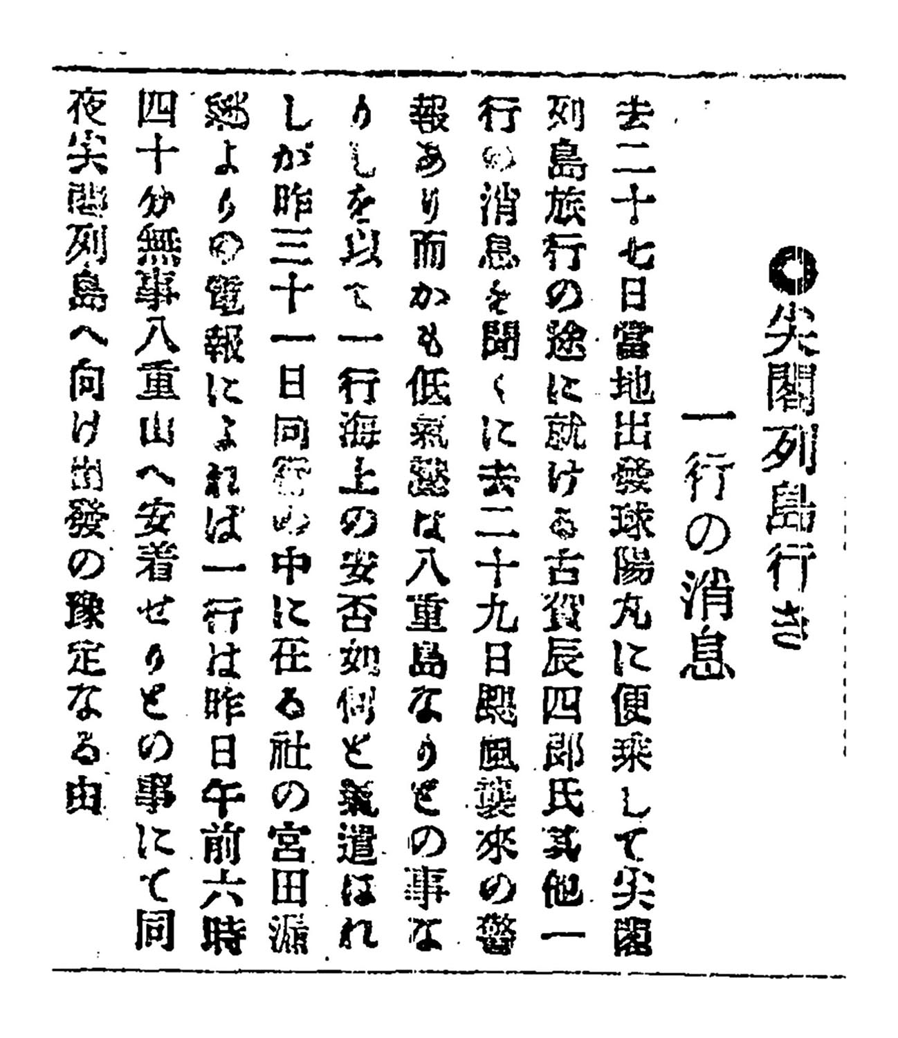 去二十七日、当地出発球陽丸に便乗して尖閣列島旅行の途に就ける古賀辰四郞氏其他一行の消息を聞くに、去二十九日台風襲来の警報あり。而かも低気■は八重島なりとの事なりしを以て一行海上の安否如何と気遣われしが、昨三十一日同行の中に在る社の宮田漏渓よりの電報によれば、一行は昨日午前六時四十分無事八重山へ安着せりとの事にて、同夜尖閣列島へ向け出発の予定なる由。