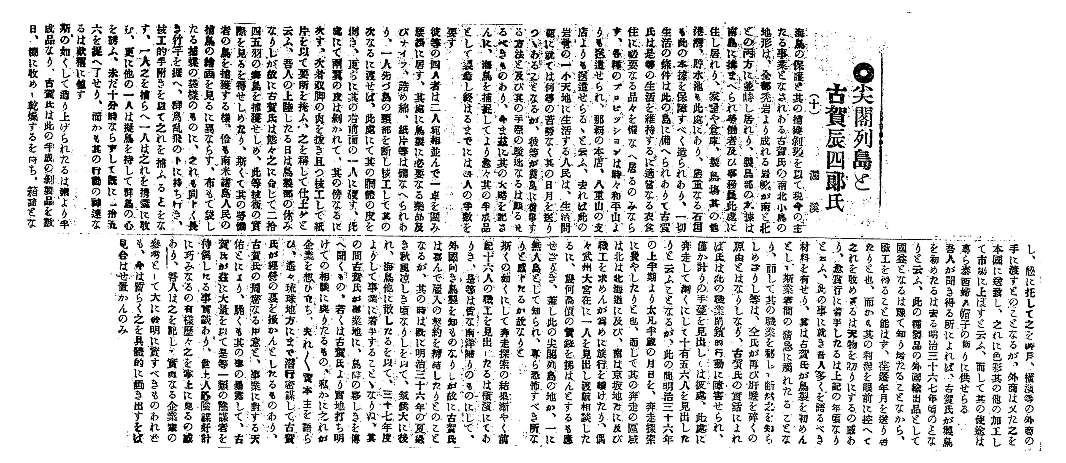 吾人が聞き得る所によれば、古賀氏が製鳥を初めたるは去る明治三十六、七年頃のことなりと言う。此の種製品の外国輸出品として国益となるは予て知り居たることながら、職工を得ること能わず。荏遷年月を送り居たりと也。而かも其の利源を眼前に控えて之れを収めざるは、天物を叨りにするの感あり。愈実行に着手したるは上記の年頃なりと言う。此の事に就き吾人多くを語るべき材料を有せり。其は古賀氏が製鳥を初めんとして斯業者間の猜忌に触れたることなり。而して其の職業を秘し■断然之を知らしめざりし等は、同氏が再び肝胆を砕くの原由とはなりしなり。古賀氏の実話によれば、氏は此の職業閉鎖的行動に障害せられ、僅か計りの手蔓を見出しては彼処、此処に奔走して漸くにして十有五、六人を見出したりと言うことなるが、此の間明治三十六年の上半期より大凡半歳の月日を奔走探索に費やしたりと也。而して其の奔走の区域は北は北海道に及び、南は京坂地方に及び、職工を求めんが為めに旅行を続けたり。偶々武州大宮在に一人を見出し渡航相談したるに、幾何高価の賃銭を払わんとするも応ぜざりき。蓋し此の尖閣列島の地が、一に無人島として知られ、専ら恐怖すべき所なりと感じたるが故なりと。