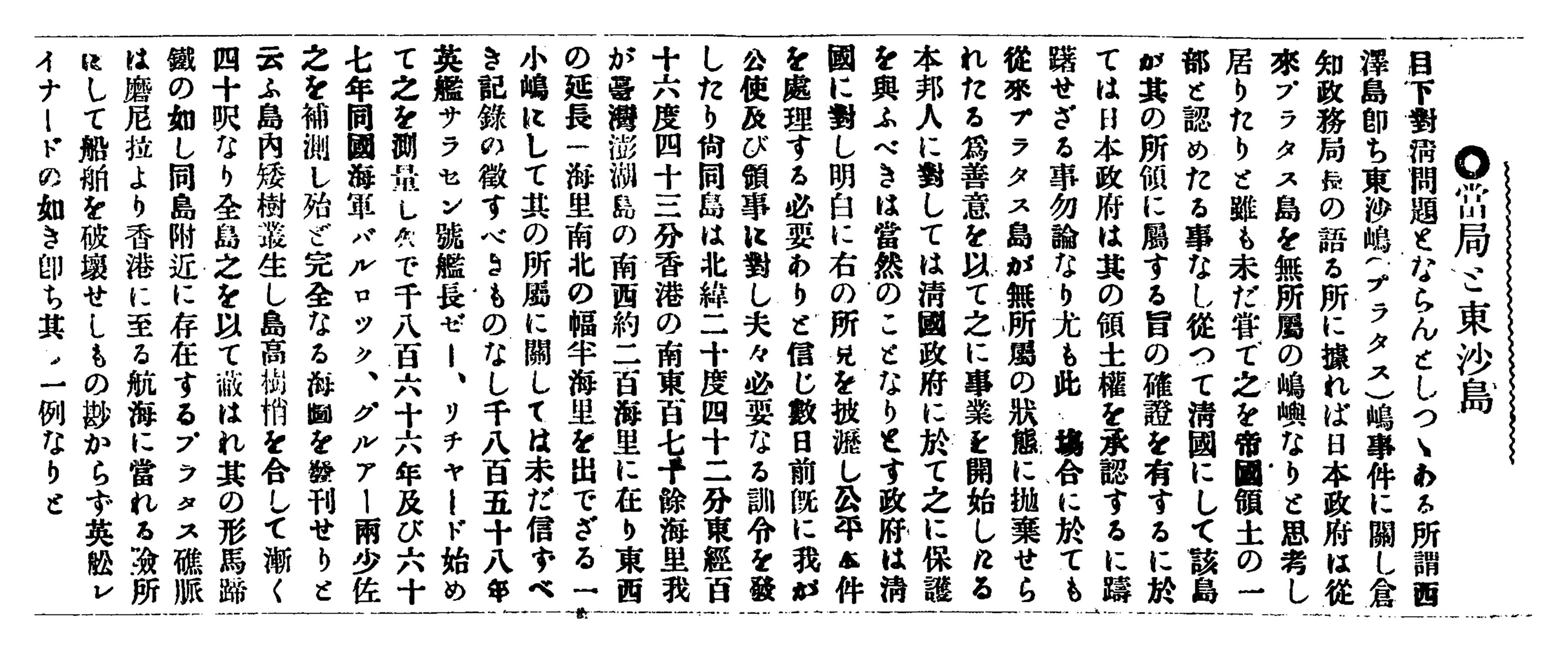目下対清問題とならんとしつゝある所謂西澤島即ち東沙島(プラタス島)事件に関し、倉知政務局長の語る所に拠れば、日本政府は従来プラタス島を無所属の島嶼なりと思考し居りたりと雖も、未だ嘗て之を帝国領土の一部と認めたる事なし。従って清国にして該島が其の所領に属する旨の確証を有するに於ては、日本政府は其の領土権を承認するに躊躇せざる事勿論なり。尤も此■場合に於ても、従来プラタス島が無所属の状態に放棄せられたる為、善意を以て之に事業を開始したる本邦人に対しては、清国政府に於て之に保護を与うべきは当然のことなりとす。政府は清国に対し明白に右の所見を披瀝し、公平本件を処理する必要ありと信じ、数日前概に我が公使及び領事に対し夫々必要なる訓令を発したり。尚同島は北緯二十度四十二分、東経百十六度四十三分、香港の南東百七十余海里我が台湾澎湖島の南西約二百海里に在り、東西の延長一海里、南北の幅半海里を出でざる一小島にして、其の所属に関しては未だ信ずべき記録の徴すべきものなし。千八百五十八年英艦サラセン号艦長ゼー、リチャード始めて之を測量し、■で千八百六十六年及び六十七年同国海軍バルロック、グルアー両少佐之を補測し、殆ど完全なる海図を発刊せりと言う。島内矮樹叢生し島高樹捎を合して漸く四十呎なり。全島之を以て蔽われ、其の形馬蹄鉄の如し。同島附近に存在するプラタス礁脈は麻尼拉より香港に至る航海に当れる検所にして船舶を破壊せしもの少からず。英船レイナードの如き即ち其の一例なりと。