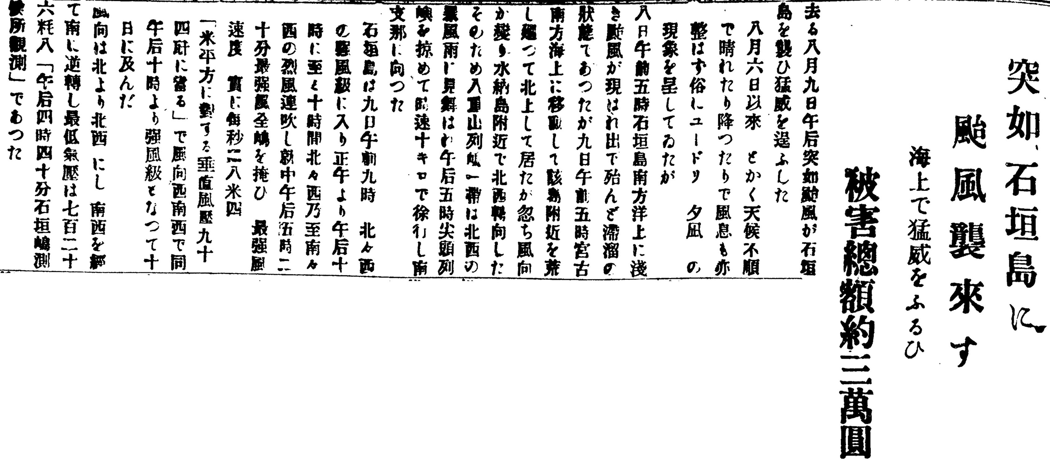 石垣島は九日午前九時、北々西の強風級に入り正午より午後十時に至■十時間北々西乃至南々西の烈風連吹し、就中午後五時二十分最強風全島を掩い、最強風速度、実に毎秒二八米四。
