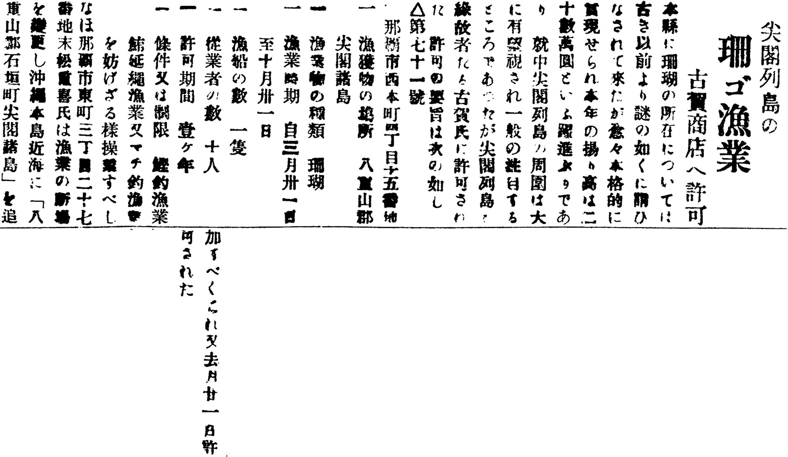 本県に珊瑚の所在については古き以前より謎の如くに言いなされて来たが、愈々本格的に実現せられ、本年の揚り高は二十数万円という躍進ぶりであり、就中尖閣列島の周囲は大に有望視され、一般の注目するところであったが、尖閣列島■緑故者たる古賀氏に許可された。許可の要旨は次の如し。