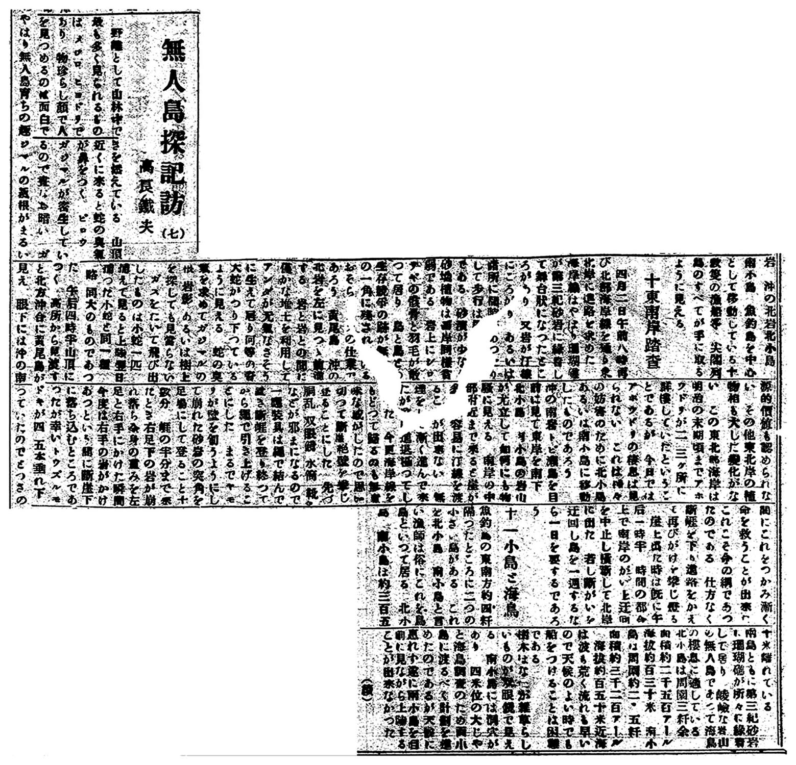 樹木はないが雑草らしいものが双眼鏡で見える 南小島には洞穴があり 四米位の大じやと海鳥調査のため両小島に渡るべく計畫を進めたのであるが天候に恵れず遂に兩小島を目前に見ながら上陸することが出來なかつた                            (續)